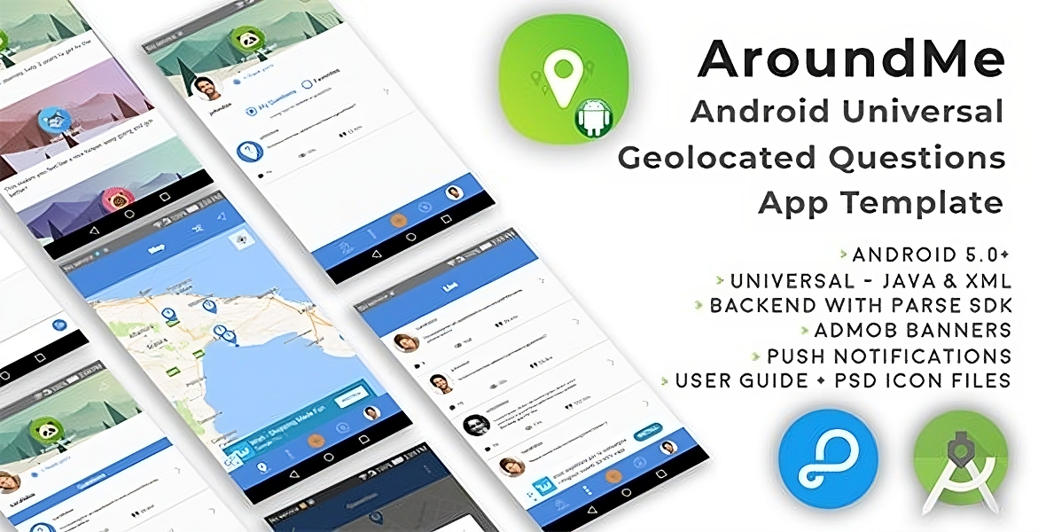 AroundMe is a native Android Studio project, Java/XML language, Universal, Parse SDK hosted on http://back4app.com, super easy to customize.
