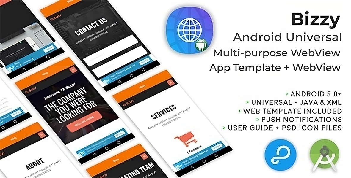 Bizzy is a native Android Studio project, Universal, super easy to customize, html, css and js files included in the “website” folder.