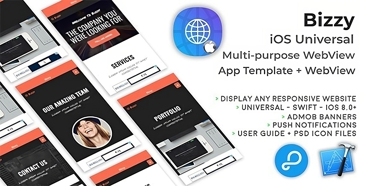 Bizzy is a Universal App with WebView + Website Template to show your business portfolio, team members, services and info in mobility.