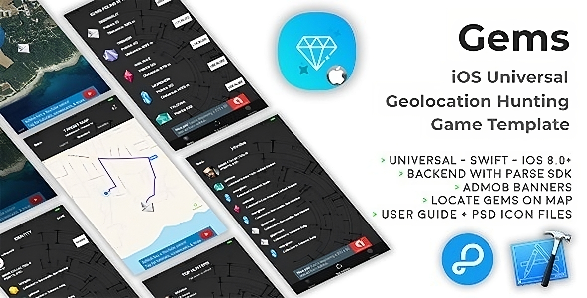 Gems is a Universal Game Template with geolocation where you have to collect as many gems as you can around your area. The app gets your current location when you sign up for the first time and randomly generates a few new Gems around your area, so you can walk or drive around to get closer and get them. once you’ve collected all gems of a round, the app gets your current location again and generates other Gems, so you don’t have to manually insert them into your own parse Dashboard.