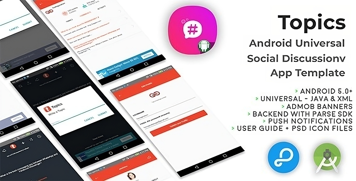 Topics is a native Android Studio project, Java/XML language, Universal, super easy to customize, backend with Parse SDK hosted on https://back4app.com