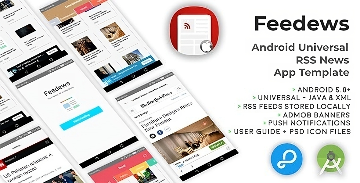 Feedews is a native Android Studio project, Java/xml language, Universal, super easy to customize. All RSS links are stored in strings.xml files and the User Guide included in the package shows how to edit them.